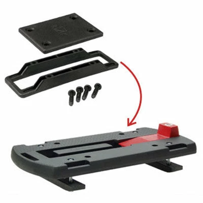 - La plaque adaptatrice qui se met sous le panier via quatre vis. Elle s’installe en quelques secondes et une fois en place, elle se clipse à la fixation sur porte-bagages tout simplement.